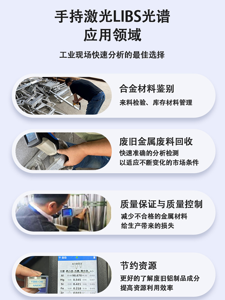 手持式激光誘導(dǎo)擊穿光譜儀利用激光誘導(dǎo)擊穿技術(shù),通過(guò)激光在樣品表面產(chǎn)生的等離子體,分析樣品中元素的含量。相比傳統(tǒng)的檢測(cè)方法,手持式激光誘導(dǎo)擊穿光譜儀具有檢測(cè)速度快、準(zhǔn)確性高、操作簡(jiǎn)便等優(yōu)點(diǎn)。使用者只需將儀器對(duì)準(zhǔn)待檢測(cè)的輕質(zhì)合金樣品,即可在幾秒鐘內(nèi)獲取到樣品的成分信息,極大地提高了檢測(cè)效率。