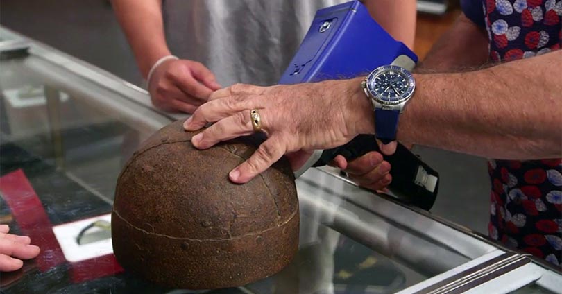 在這一期節(jié)目中,一位顧客帶來了一個被認(rèn)為是鐵做的頭盔。一位專家證實(shí),這是一個約有1500年歷史的真正的盎格魯-撒克遜頭盔。這頂頭盔完好無損,是一件非常罕見的古董。通常情況下,鐵會在有氧氣存在的環(huán)境中分解,因此這個頭盔很可能被遺留在如沼澤或河流等的缺氧環(huán)境中而得以完好保存。