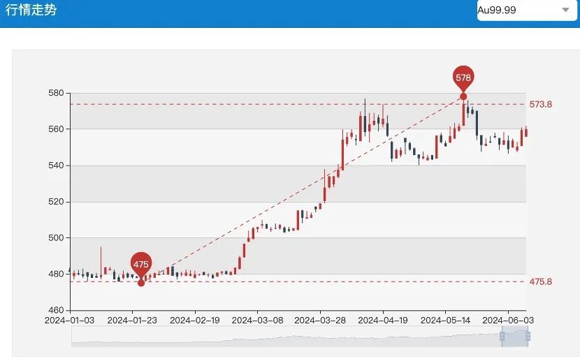 拉長時間看,盡管近期現(xiàn)貨黃金價格有所回落,但年初至6月7日漲幅仍超11%。國內(nèi)金價亦不斷攀升,上海黃金交易所AU9999年內(nèi)最高觸及578元/克,較年初低點(diǎn)475元/克漲幅達(dá)21.68%。