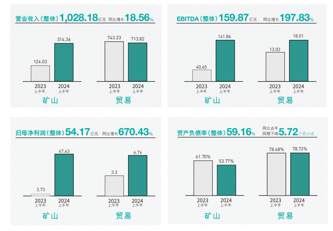 8月23日晚,洛陽(yáng)鉬業(yè)發(fā)布的2024年中期報(bào)告顯示,上半年公司實(shí)現(xiàn)營(yíng)業(yè)收入1028.18億元,同比增長(zhǎng)18.56%,實(shí)現(xiàn)歸母凈利潤(rùn)54.17億元,同比增長(zhǎng)670.43%,均創(chuàng)下歷史新高;實(shí)現(xiàn)息稅折攤前利潤(rùn)159.87億元,增長(zhǎng)197.83%,資產(chǎn)負(fù)債率59.16%,同比下降5.72個(gè)百分點(diǎn)。同時(shí),公司流動(dòng)性充裕,上半年經(jīng)營(yíng)性?xún)衄F(xiàn)金流108億元,持有現(xiàn)金及現(xiàn)金等價(jià)物309億元。