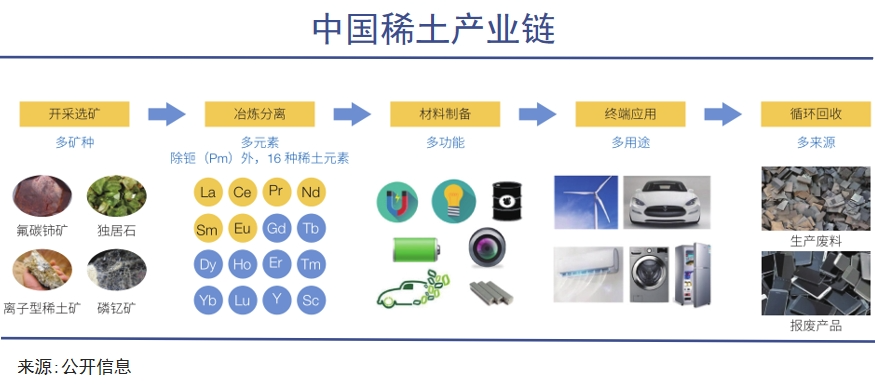 三是產業鏈完備。中國是全球唯一具備稀土全產業鏈產品生產能力的國家,從原材料的開采、冶煉、分離、加工,循環回收等五個環節,均能夠自主完成。這些年,隨著中國稀土集團的成立,中國的稀土產業鏈越發完善。