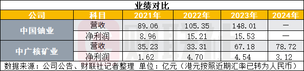 從業績方面來看,中國鈾業實力較中廣核礦業更強,2021-2023年中國鈾業營收分別為89.06億元、105.35億元、148.01億元,凈利潤分別為8.96億元、15.21億元、15.53億元;2021-2024年中廣核礦業營收分別為38.60億港元、36.49億港元、73.60億港元、86.24億港元,凈利潤分別為1.78億港元、5.15億港元、4.97億港元、3.42億港元。