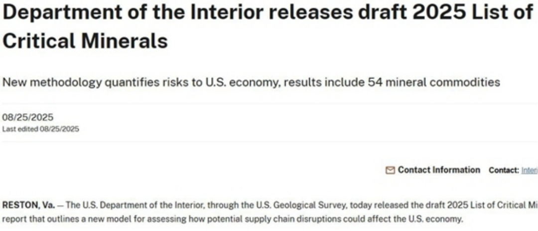 當地時間8月25日,美國地質調查局發布《2025年關鍵礦產清單》草案,54種礦產被列入清單。根據美國《能源法案》,關鍵礦產是由美國地質勘探局認定的對美國經濟和國家安全至關重要的礦產或物質,且相關礦產是產品制造的基礎,但供應鏈脆弱。被確定為關鍵礦產后,相關礦產的勘探開采和處理將享受資金激勵和更廣泛的支持性政策。
