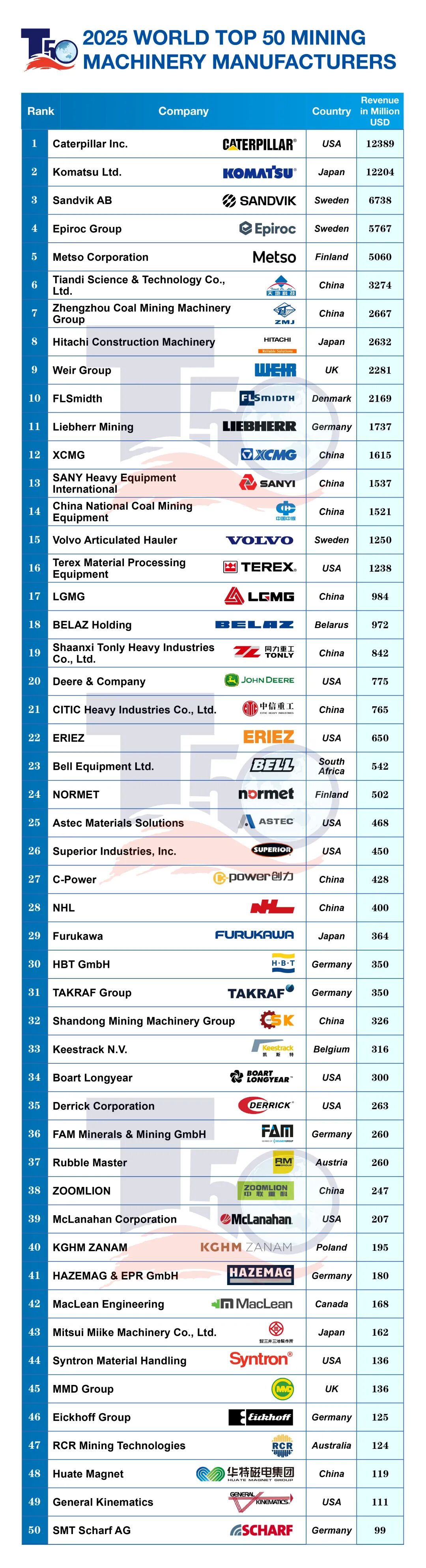 同時,中國企業的整體表現令人矚目。天地科技、鄭煤機集團、徐工集團等 13 家中國企業躋身榜單,在上榜數量上位居各國之首。其中,天地科技以 32.74 億美元的收入位列全球第六,成為中國企業中的領跑者;徐工集團、三一國際、臨工重機與同力重工等企業也成功進入全球前 20 強,反映出中國企業在全球礦山設備市場的影響力持續提升。這一數據表明,中國礦業裝備制造業正在全球市場快速崛起。